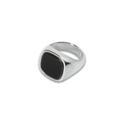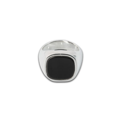 Signet ring with 14 mm cushion black quartz made of solid 925 Sterling Silver with a BACKYARD engraving on the inside. Polished finish. Also available in solid 9k Gold or 18k Gold. All our jewels are completely gender neutral. Crafted in Turin, Italy.