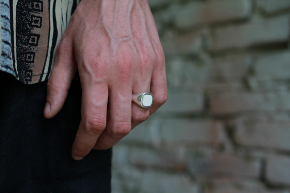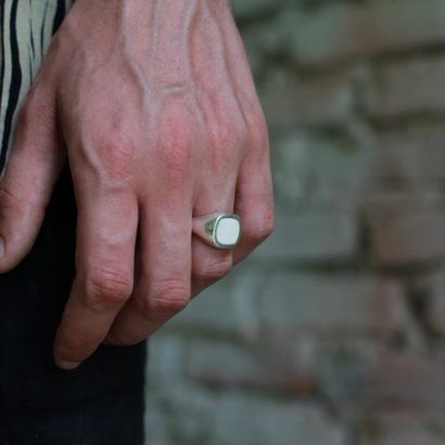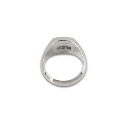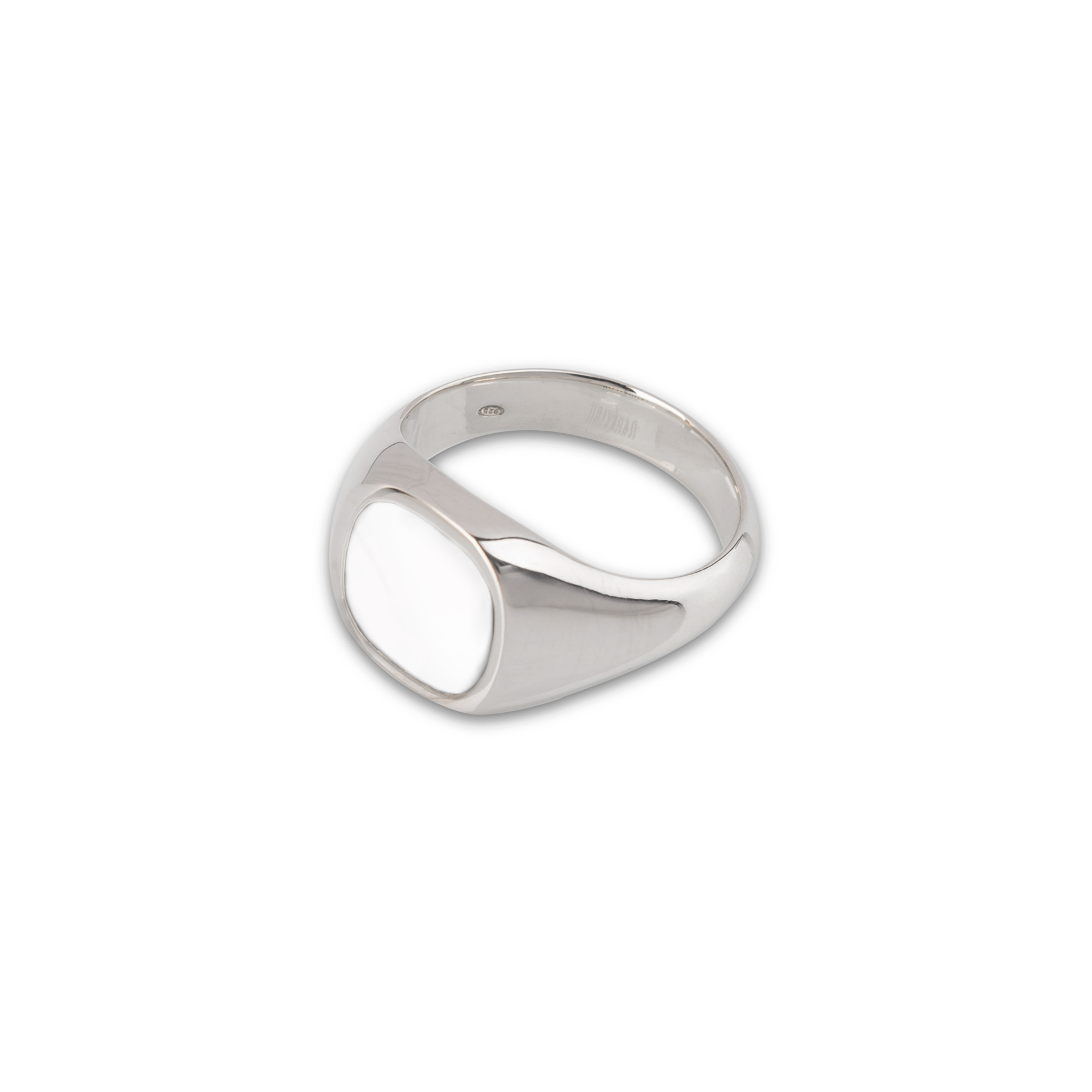 Signet ring with 10 mm cushion white agate made of made of solid 925 Sterling Silver with a BACKYARD engraving on the inside. Polished finish. Also available in solid 9k Gold or 18k Gold. All our jewels are completely gender neutral. Crafted in Turin, Italy.
