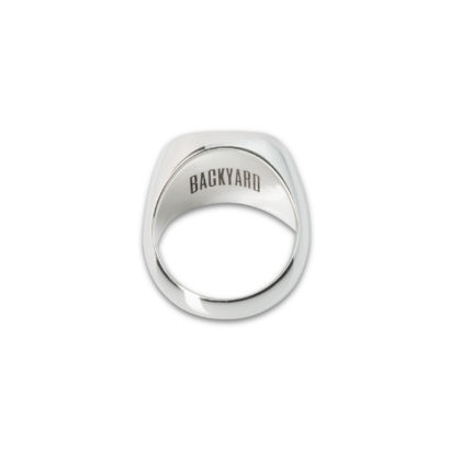 Signet ring with 14 mm cushion white agate made of solid 925 Sterling Silver with a BACKYARD engraving on the inside. Polished finish. Also available in solid 9k Gold or 18k Gold. All our jewels are completely gender neutral. Crafted in Turin, Italy.